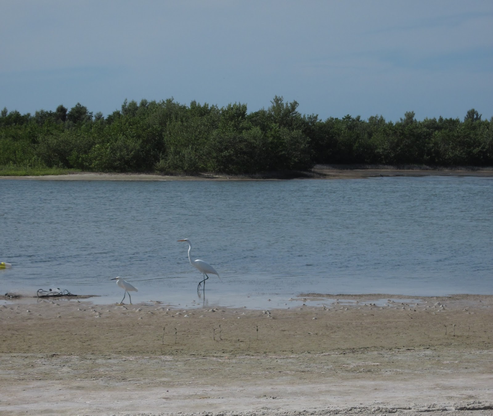 Saturday. This fisherman at the inlet had company: an egret and a great egret.