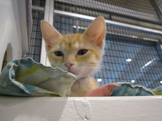 Not all the kittens were sleepy when I was there yesterday. I had Peter going all over after the fishing pole; he's still a little watchful, but much less scared, and he loves that dangling toy. I had to be careful: once I almost sent him head-first into his water bowl, and another time the bowl of crunchies almost got tipped over.